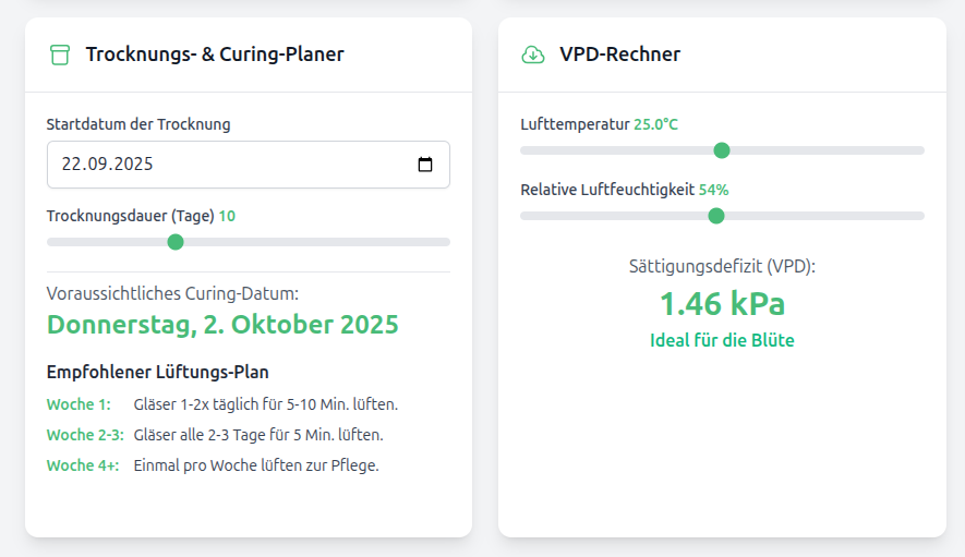 Nutzen Sie den Trockengewichtsrechner, die Ertragsprognose sowie den Ernte- und Curing-Planer für eine präzise Zeitplanung und Qualitätsoptimierung.