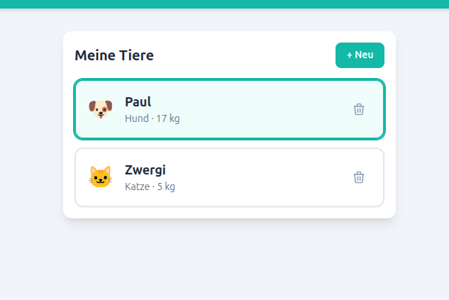 Ihre Tierprofile werden lokal in Ihrem Browser gespeichert. Das bedeutet, dass keine persönlichen Daten auf unseren Servern landen. Ihre Privatsphäre ist somit vollständig geschützt. Sie können den Rechner kostenlos und sicher nutzen, ohne dass Ihre Daten geteilt werden. Bei Browserwechsel oder -reset gehen die Daten verloren.