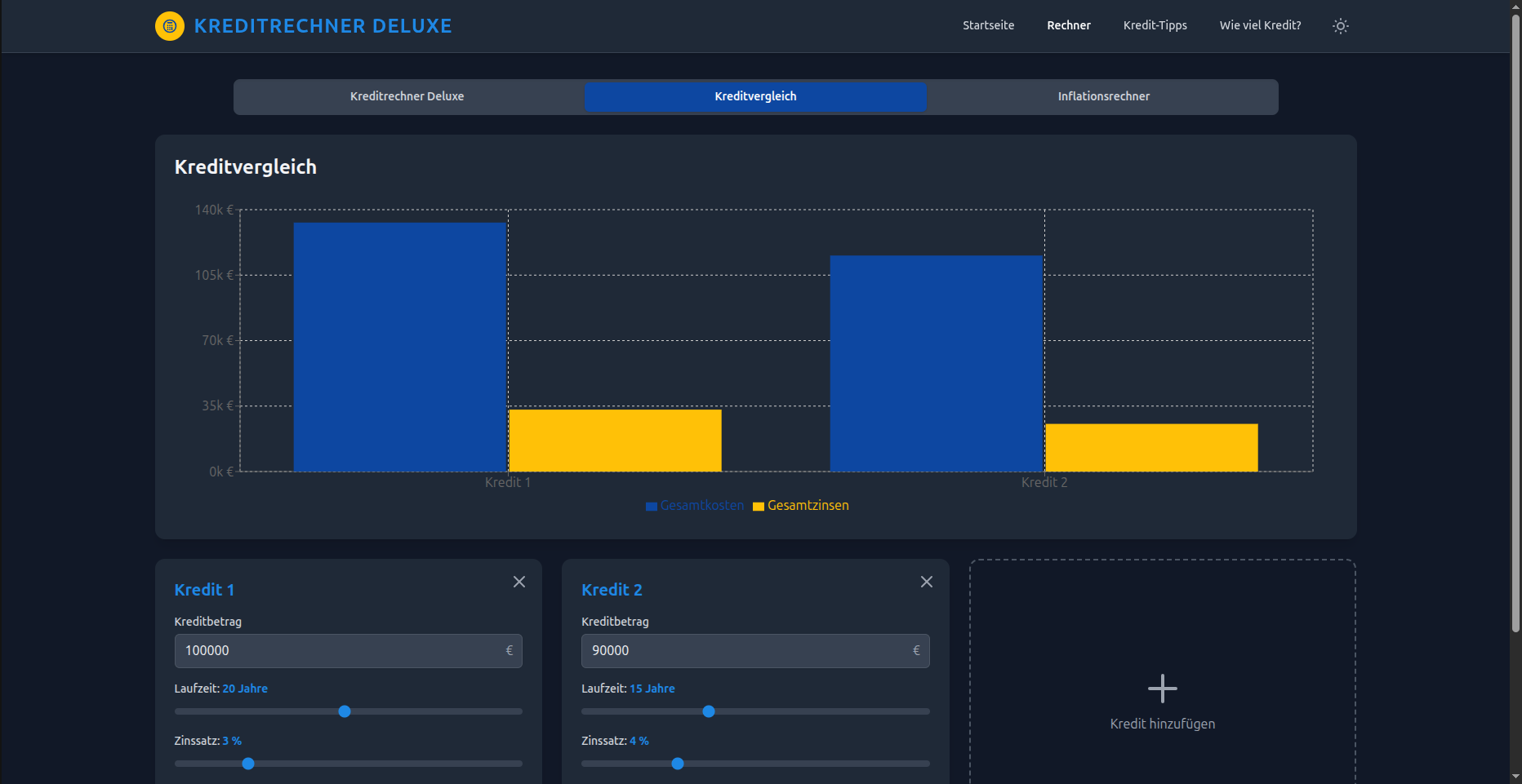 Die Planung von Krediten und das Verständnis der Inflation sind entscheidend für eine stabile finanzielle Zukunft. Viele Menschen fühlen sich von komplexen Berechnungen überfordert und sind unsicher, wie sich Zinsen, Tilgung und die fortschreitende Geldentwertung auf ihre finanzielle Situation auswirken. Unser Kreditrechner Deluxe löst dieses Problem, indem er eine intuitive und präzise Plattform bietet, um all diese Aspekte zu beleuchten. Egal ob Baufinanzierung, Ratenkredit oder Autokredit – unser Tool ermöglicht es Ihnen, Szenarien durchzuspielen und die Auswirkungen der Inflation zu verstehen. Und das Beste: Es ist komplett kostenlos und 100% anonym, sodass Sie ohne Risiko fundierte Entscheidungen treffen können. Nutzen Sie diesen kostenlosen Service für Ihre Kreditplanung.