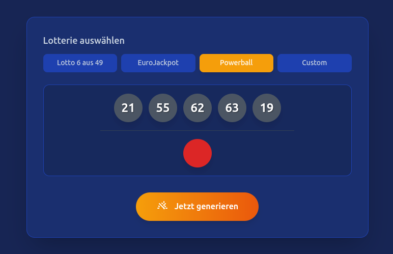 Ihre Glückszahlen sind nur einen Klick entfernt! Nutzen Sie unseren Lottozahlen Generator für eine unvoreingenommene, zufällige und sichere Auswahl. Egal, ob für Lotto 6 aus 49, EuroJackpot oder Powerball – starten Sie jetzt in die nächste Ziehung. Spielen Sie verantwortungsbewusst und lassen Sie sich von unserem Lottozahlen Generator inspirieren!