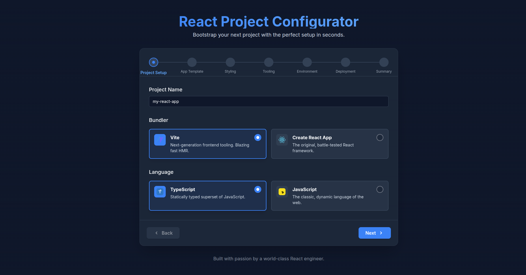 Wählen Sie Ihre bevorzugten Tools wie Vite, Tailwind CSS, Redux, Jest und Docker in einer interaktiven UI, um ein perfekt auf Ihre Bedürfnisse zugeschnittenes React-Projekt zu erhalten.